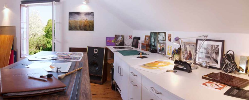 I produce the prints in my garden-studio in Normandy. The building was originally a stables for a horse and cart and when we first arrived here it still had the horse’s ‘manger’! Sadly we had to re-think the space in order to convert it into a studio, but either way, I still like to think that once upon a time, a horse lived in my studio.